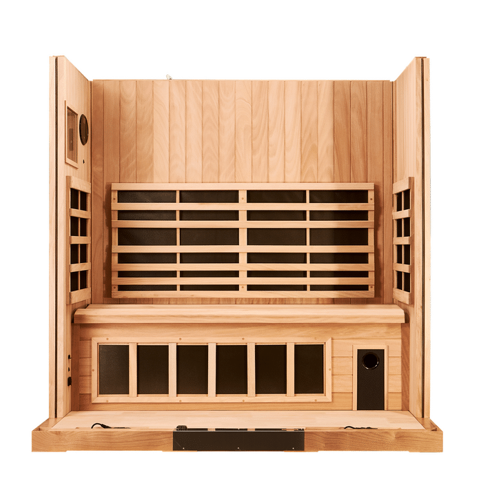 The Jacuzzi® 3-person infrared sauna offers a relaxing space for wellness and rejuvenation. Full-spectrum heaters and high-intensity red light therapy provide soothing warmth that eases muscle tension and promotes recovery. Ergonomic seating and vibrational resonance therapy enhance comfort, while Bluetooth audio adds a customizable entertainment experience. Built with durable materials, including a replaceable wood floor and reinforced construction, it delivers lasting quality and luxury for your home spa.